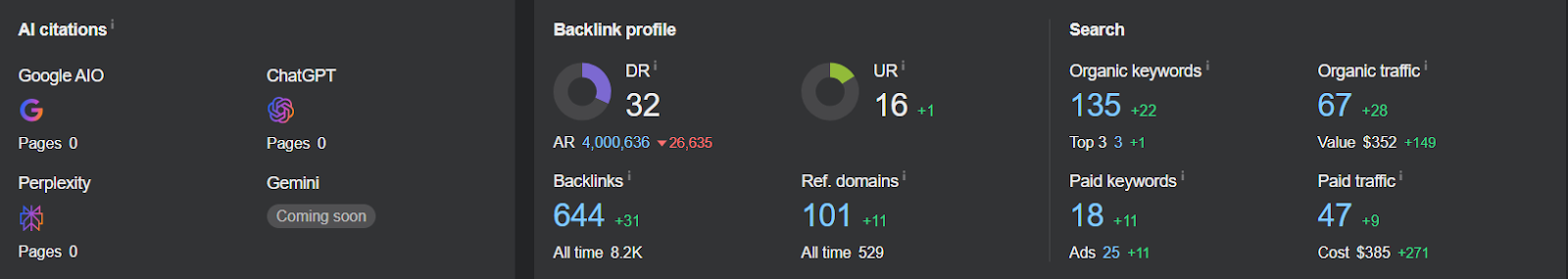 According to Ahrefs, the Domain Rating (DR) remained consistent at 32, while traffic increased from 67 to 73 in July. Along with this traffic increase, we also observed a significant improvement, with one page of Senegal Software being featured in the AI Overview.