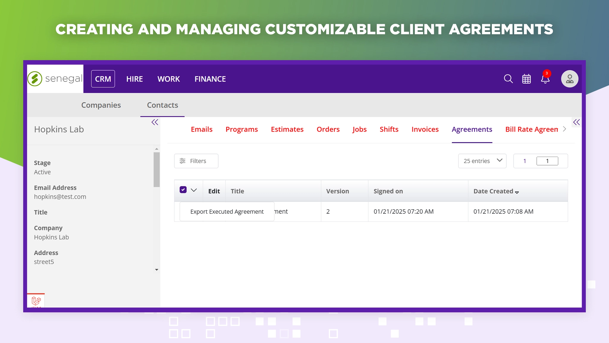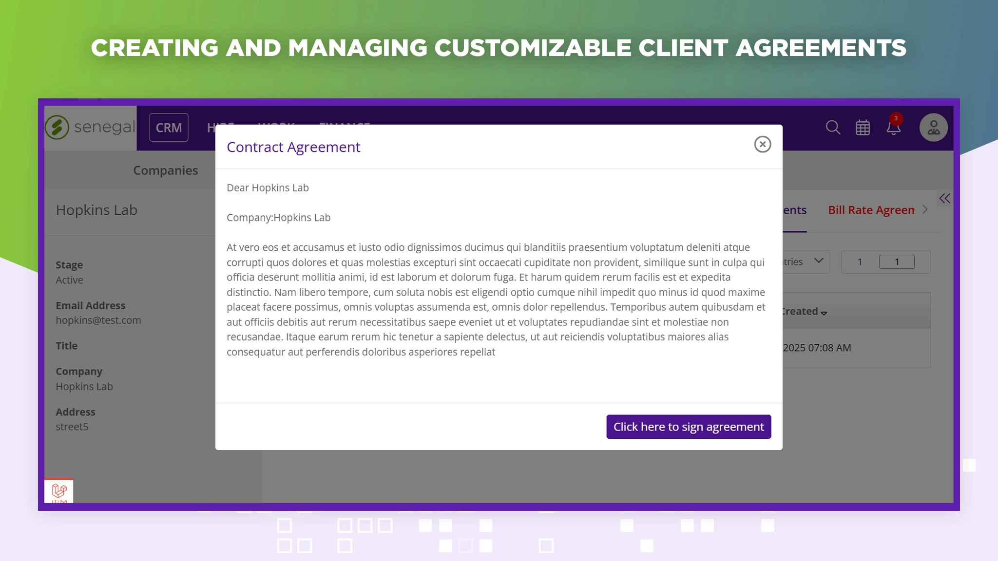 Client Agreements in Senegal Software are customizable templates for quick and easy client onboarding and document management. System administrators can create, edit, and format agreements via rich-editing tools under “CRM Settings.” These agreements can be saved as reusable templates and accessed within a contact’s profile. Users can personalize agreements by auto-populating client details and sending them for digital signatures directly. Once signed, the agreement status and data update automatically in the CRM, ensuring efficient contract management.